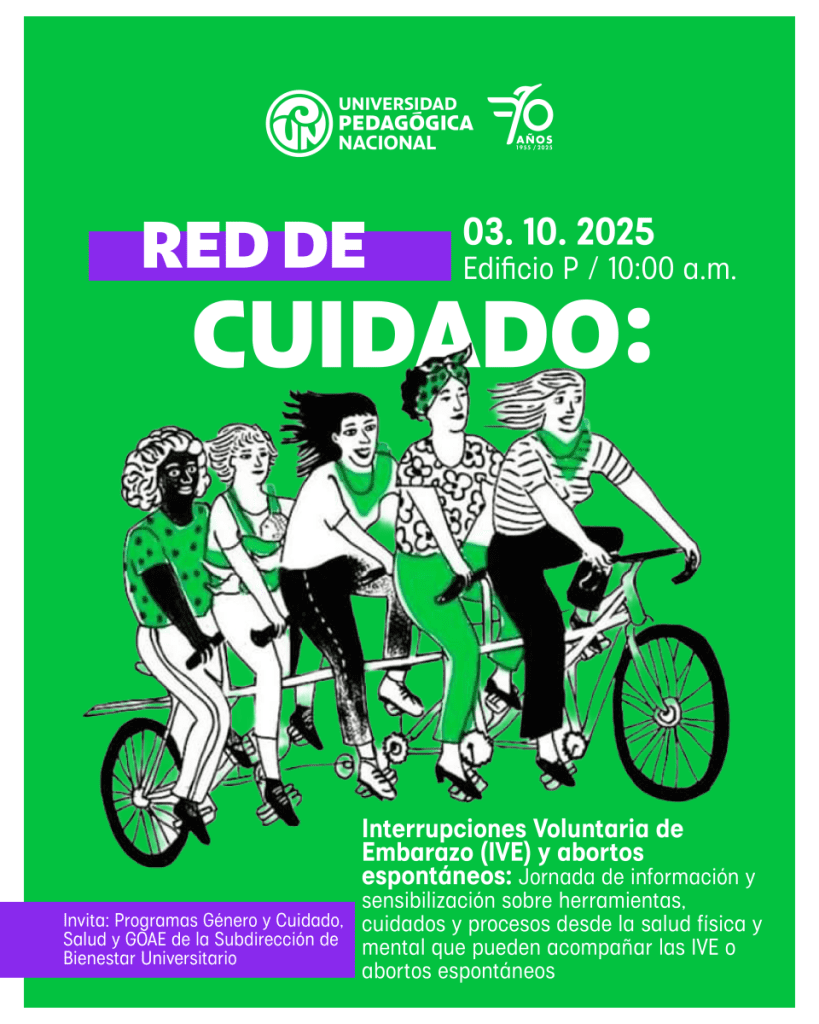 📣Los programas de Género y Cuidado- Salud y el Grupo de Orientación y Acompañamiento Estudiantil (GOAE) de la Subdirección de Bienestar Universitario invita al evento Red de cuidado: Interrupciones Voluntaria de Embarazo (IVE) y abortos espontáneos 👩🏻, una jornada de información y sensibilización sobre herramientas, cuidados y procesos desde la salud física y mental que pueden acompañar las IVE o abortos espontáneos